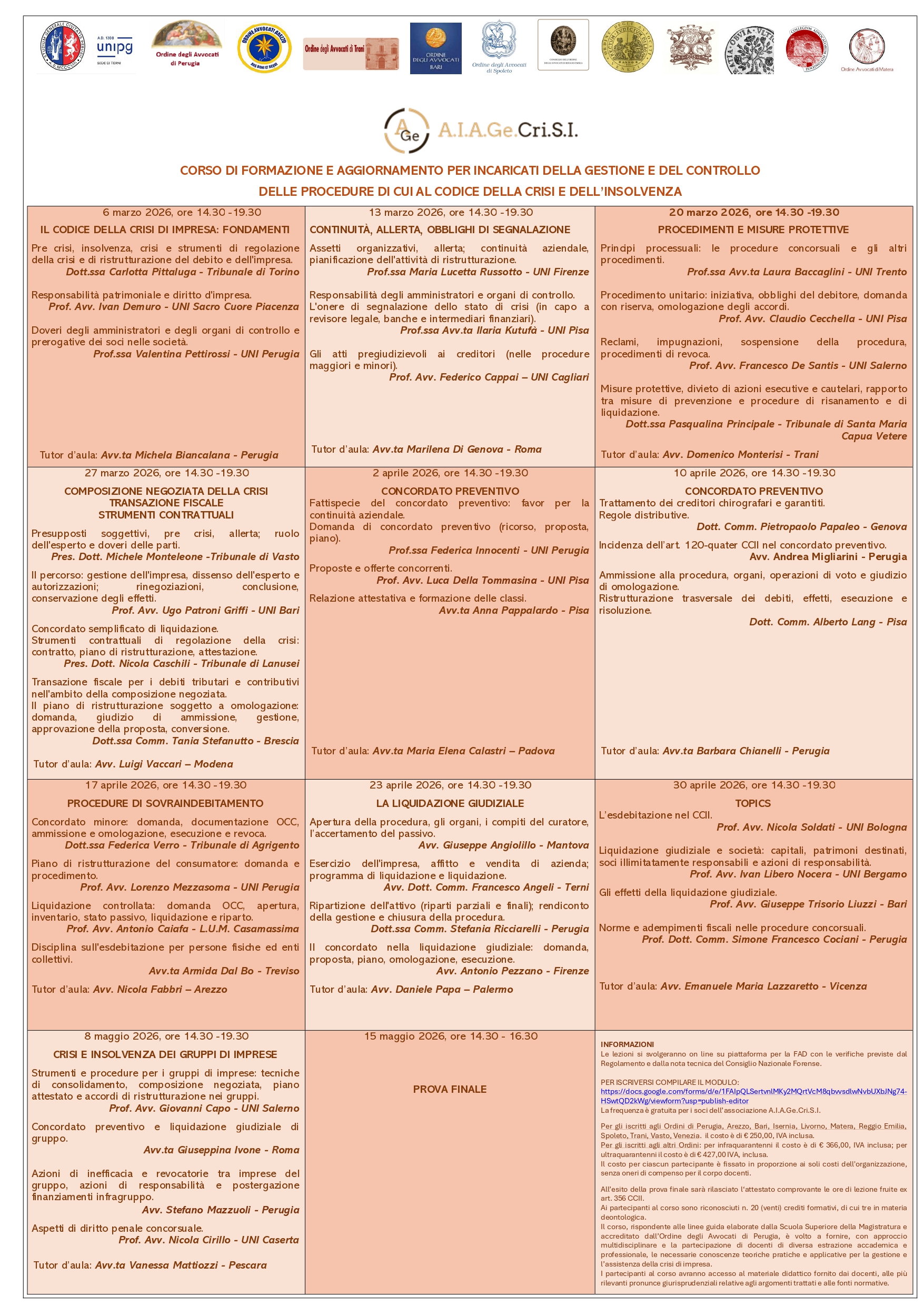 CORSO DI FORMAZIONE E AGGIORNAMENTO PER INCARICATI DELLA GESTIONE E DEL CONTROLLO DELLE PROCEDURE DI CUI AL CODICE DELLA CRISI E DELL’INSOLVENZA