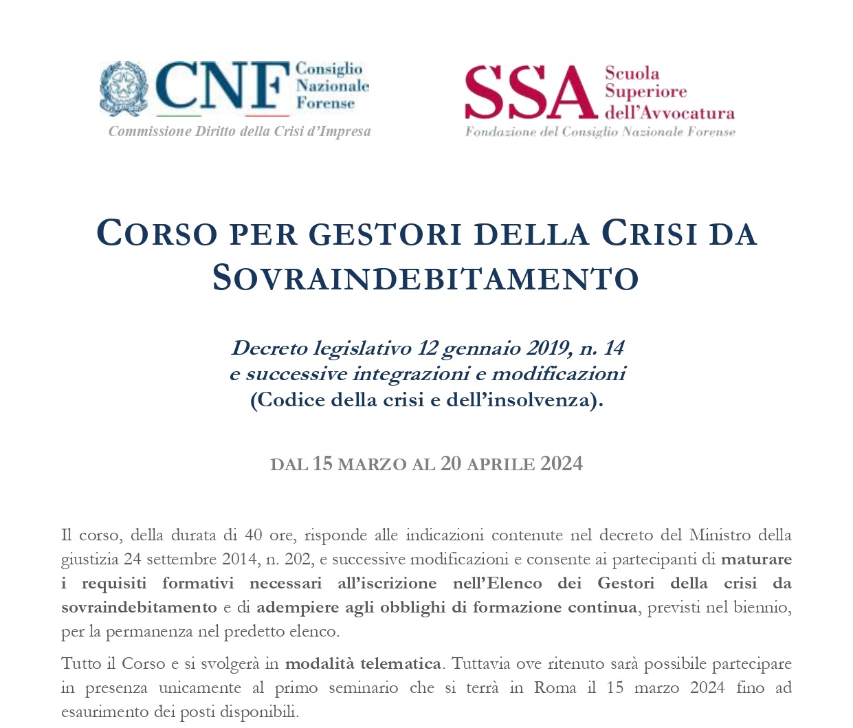 - Causale: [Nome] [Cognome] – iscrizione Corso sul sovraindebitamento