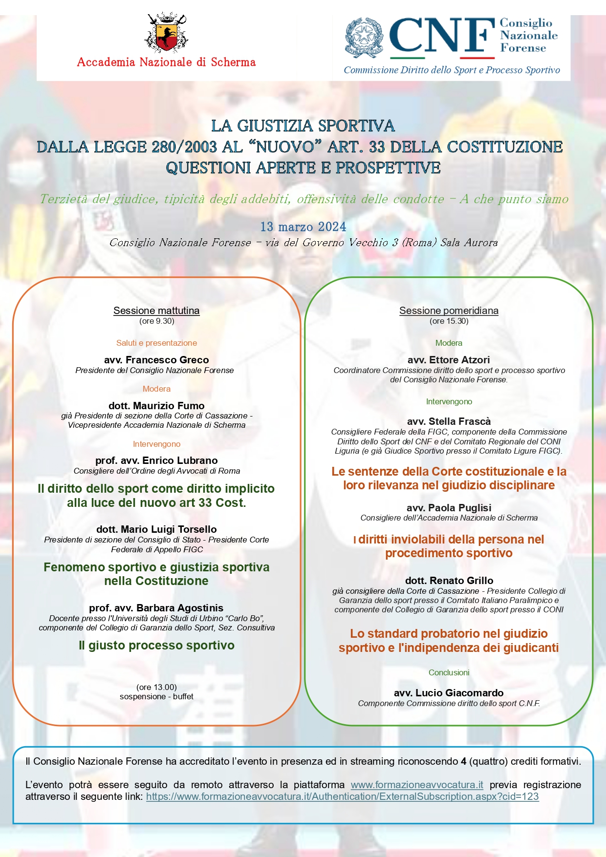 L’evento potrà essere seguito da remoto attraverso la piattaforma www.formazioneavvocatura.it previa registrazione attraverso il seguente link: https://www.formazioneavvocatura.it/Authentication/ExternalSubscription.aspx?cid=123